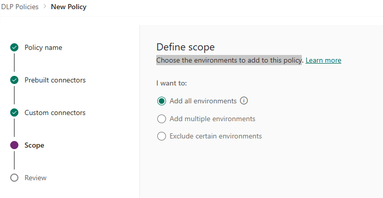 - Under Scope, choose the environments to add to this policy. I’ve chosen Add all environments
