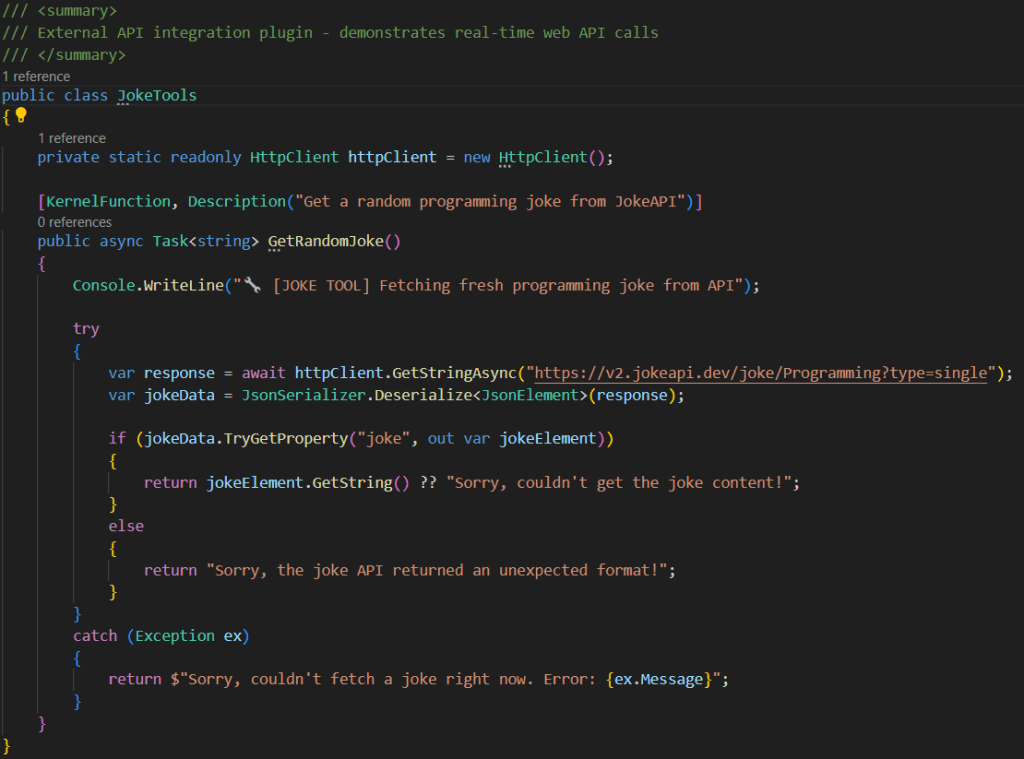 KernelFunctionattribute. - The Description text is what the AI reads to decide which tool to use when user prompts.