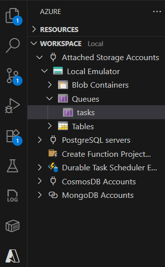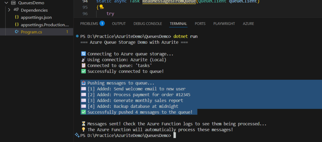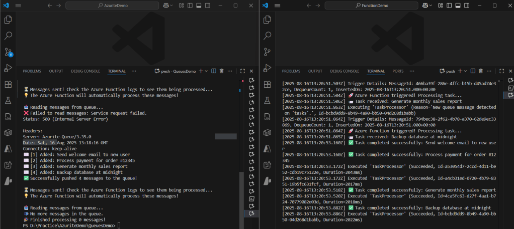 tasksqueue. - On the right, the FunctionDemo project listens to the queue and prints the messages as they arrive.