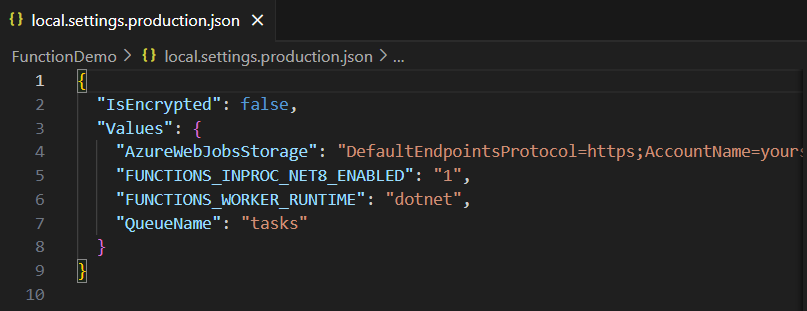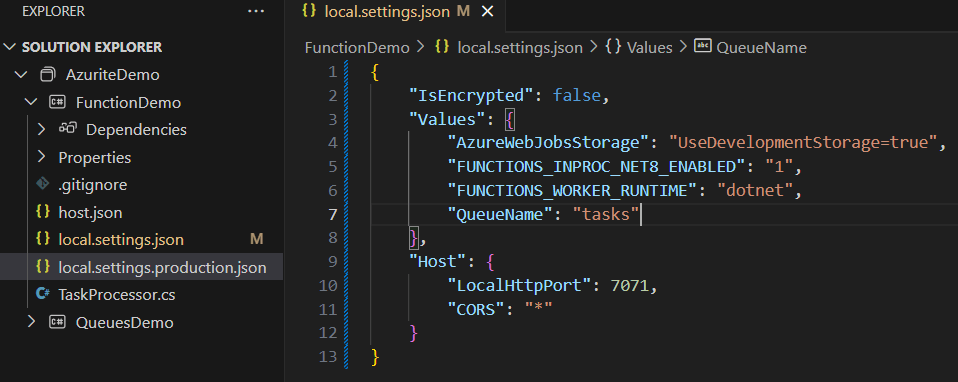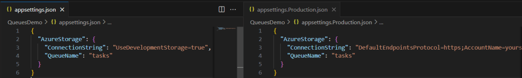- “ConnectionString”: “UseDevelopmentStorage=true” denotes you are using queues locally. When you move to Azure, replace the