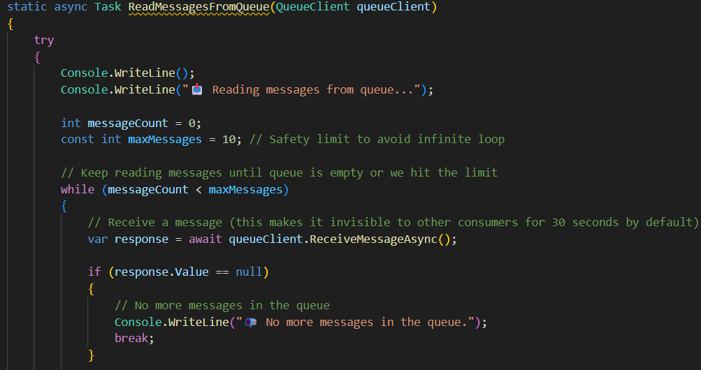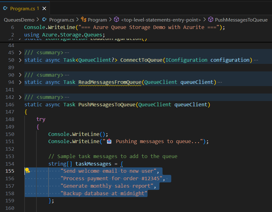 Storageconnection string with your real Azure Storage account connection string (no code changes needed). - My Program.cs file is simple. In the PushMessagesToQueue function I a mpusing four strings to the queue as highlighted below.