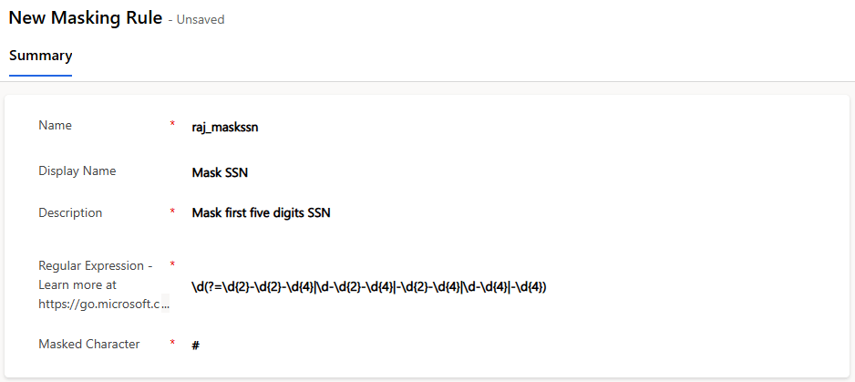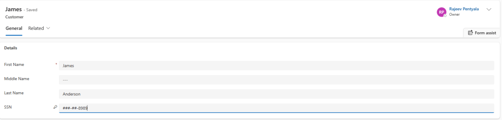 - Save. Once the record is saved the SSN will be masked as shown below.
