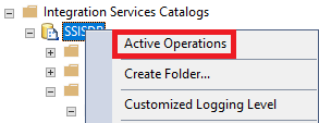 - Right click on Integration Services Catalogs > SSISDB and choose Active Operations