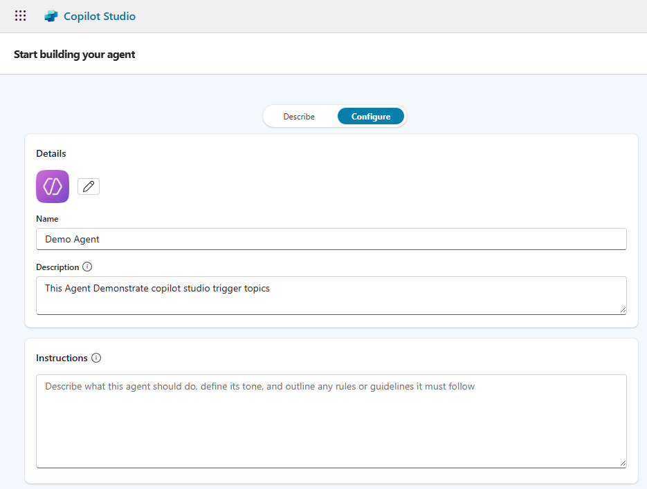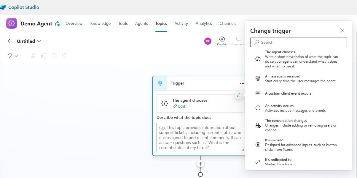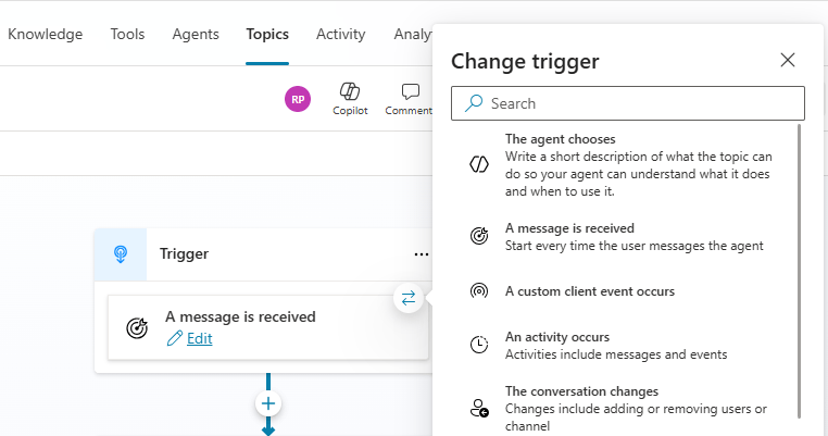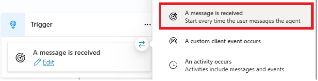 In Copilot Studio, we use the Message Received trigger to initiate a response whenever a user types or says something to the agent.