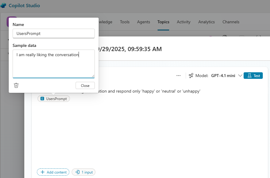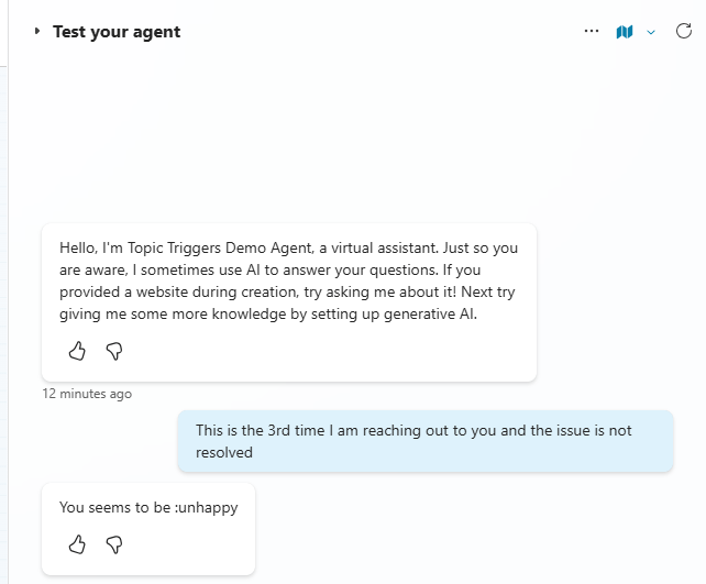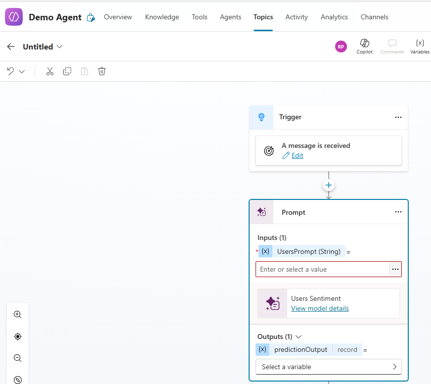 Now that you have a basic understanding of Topics ,Triggers and Prompt Actions , let’s return to our use case—detecting user sentiment based on their message.