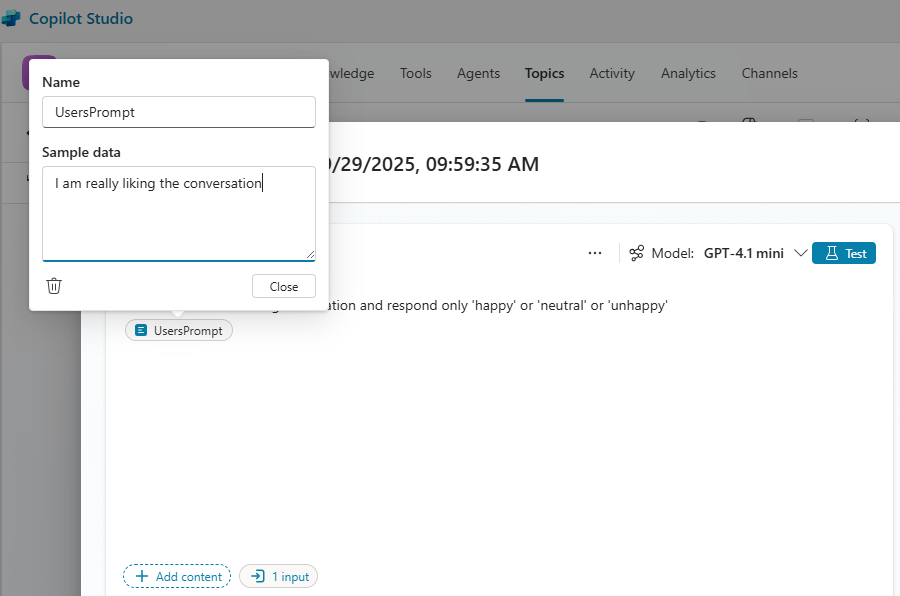 - Rename the prompt to Users Sentiment. You can click Test to simulate the conversation.
