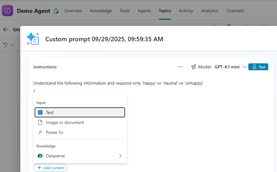 - Click + Add content and choose Text (This step defines a variable and is required to pass the users message from the topic to this prompt).