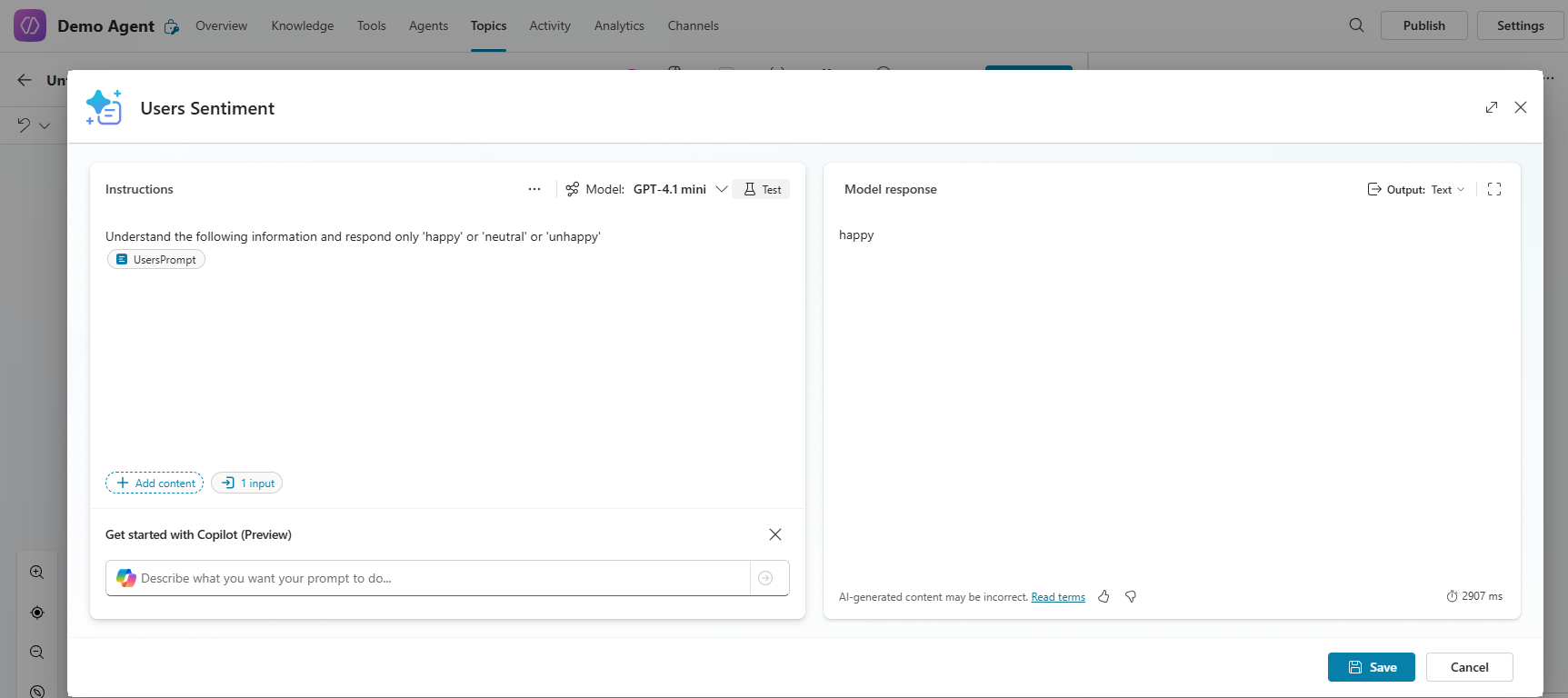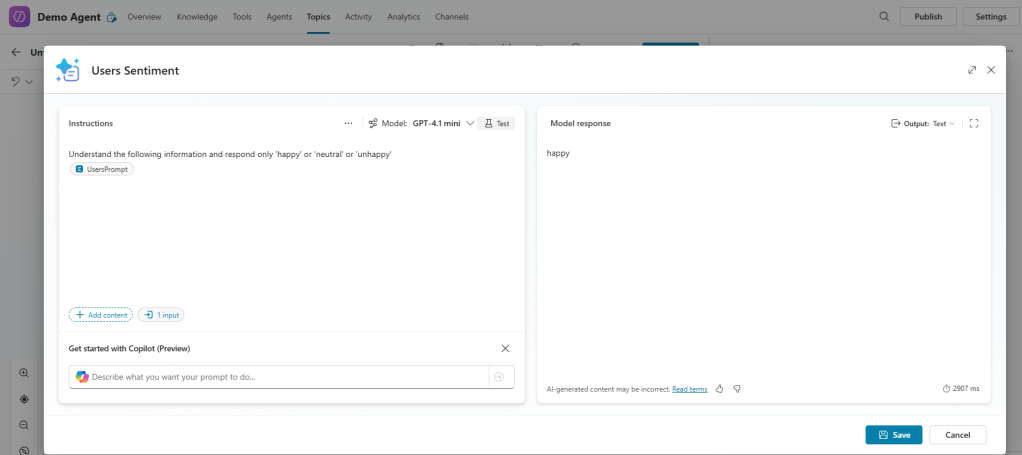Microsoft Copilot Studio offers tools to build intelligent Agents. Imagine a user completes a support chat and says, “That was super helpful, thanks!”—you’d want your agent to recognize this positive sentiment and respond appropriately.
