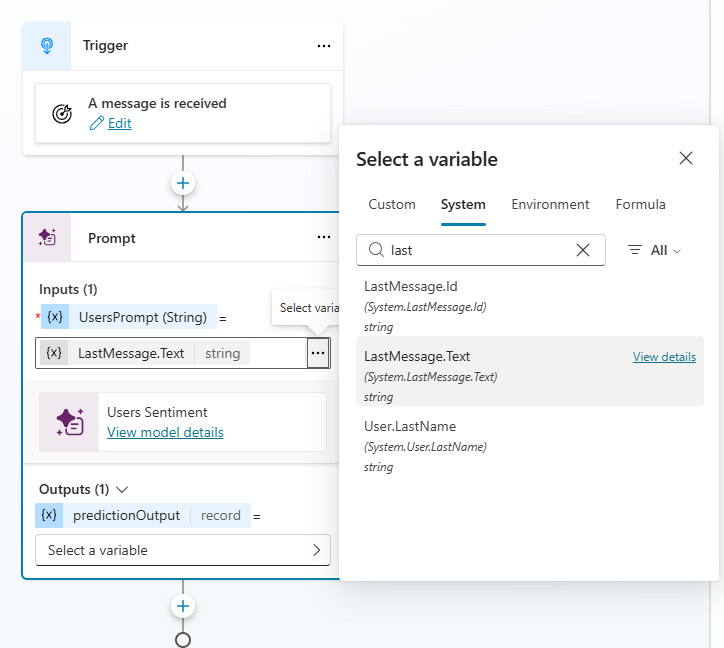 - Pass the System variable LastMessage.Text as UsersPrompt input.