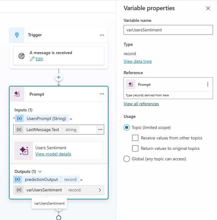 - Name the output variable varUsersSentiment. This variable will store the sentiment result for further use in your topic flow.