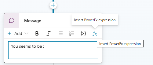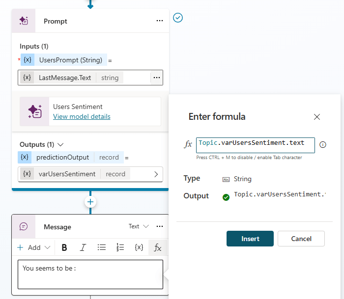 textproperty to retrieve the actual sentiment value. - Add a Message node to the topic and click on fx