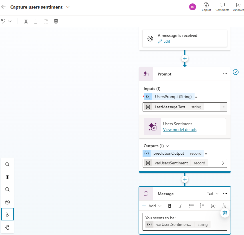 - Next print the response (i.e.,varUsersSentiment) returned from the Prompt