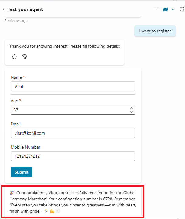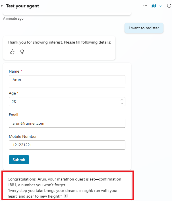 When you test the agent, the response from the Generative Message action appears as shown below.