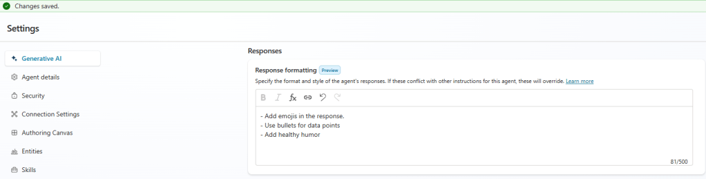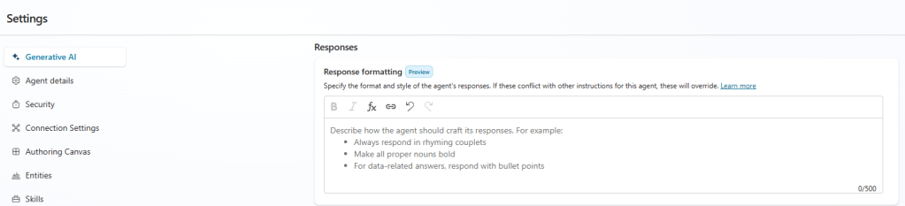 - Navigate to Agent → Settings → Responses → Response formatting.