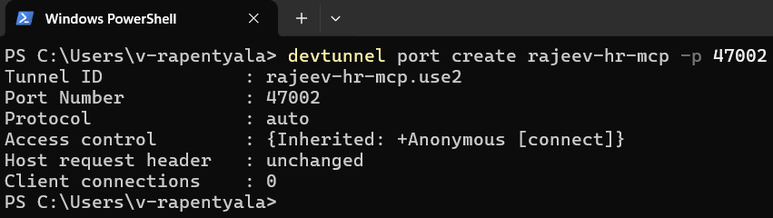 devtunnel port create rajeev-hr-mcp -p 47002