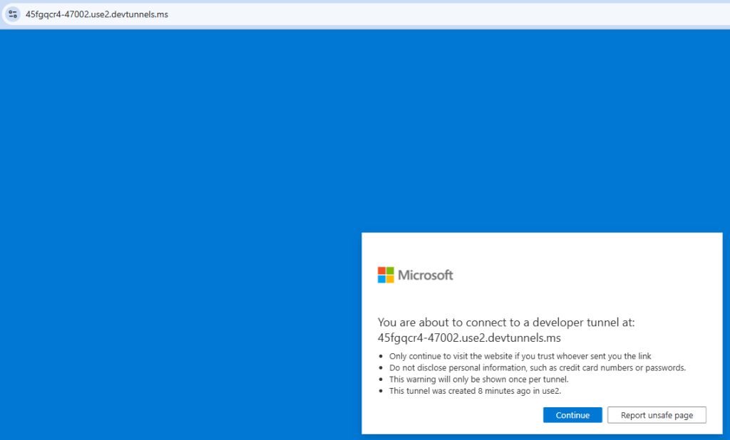- Open a browser and navigate to the just copied URL. You might need to confirm that you want to consume the MCP server via the dev tunnel through a confirmation page like the following one.