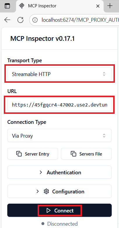 - Configure the MCP Inspector with the following settings: