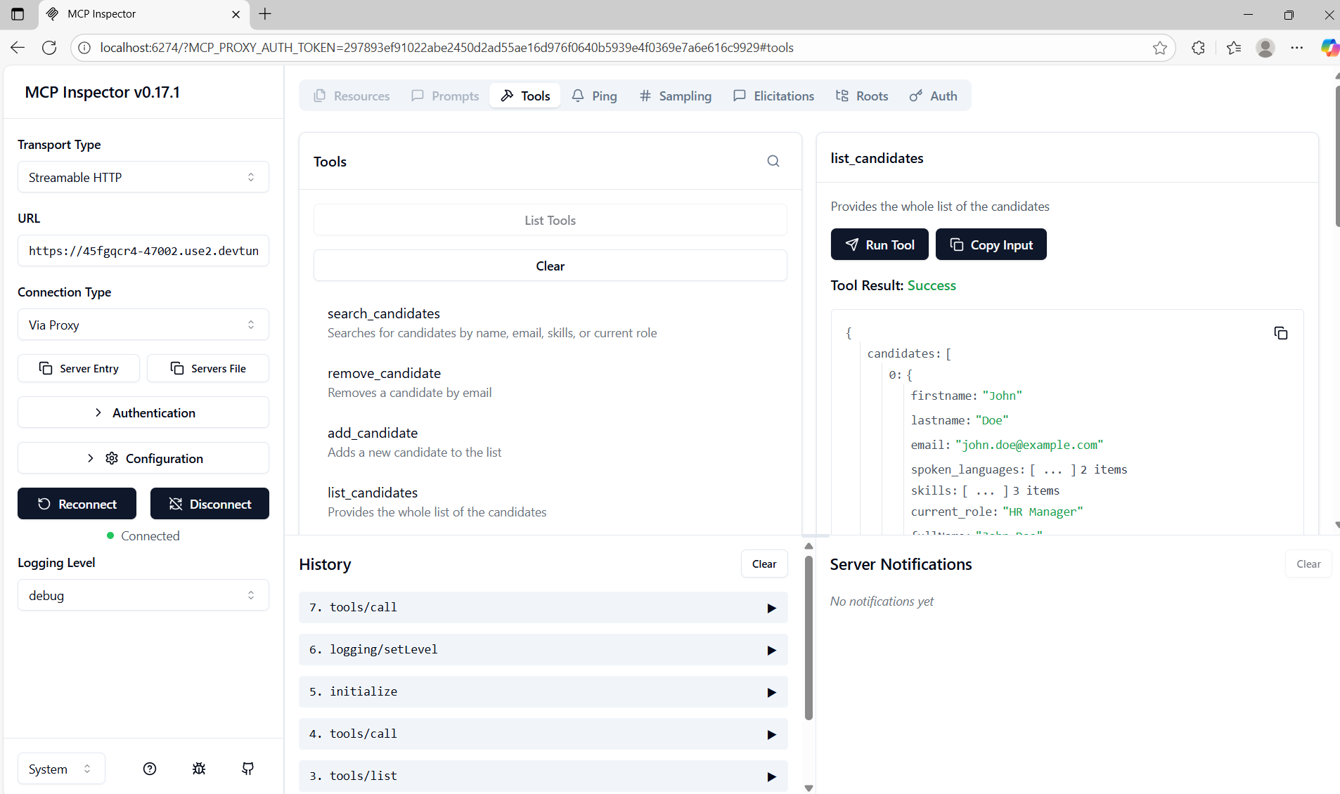 - To test, you can select the list_candidates tool, and then select Run tool to invoke the selected tool. You will see the response JSON in Tool Result