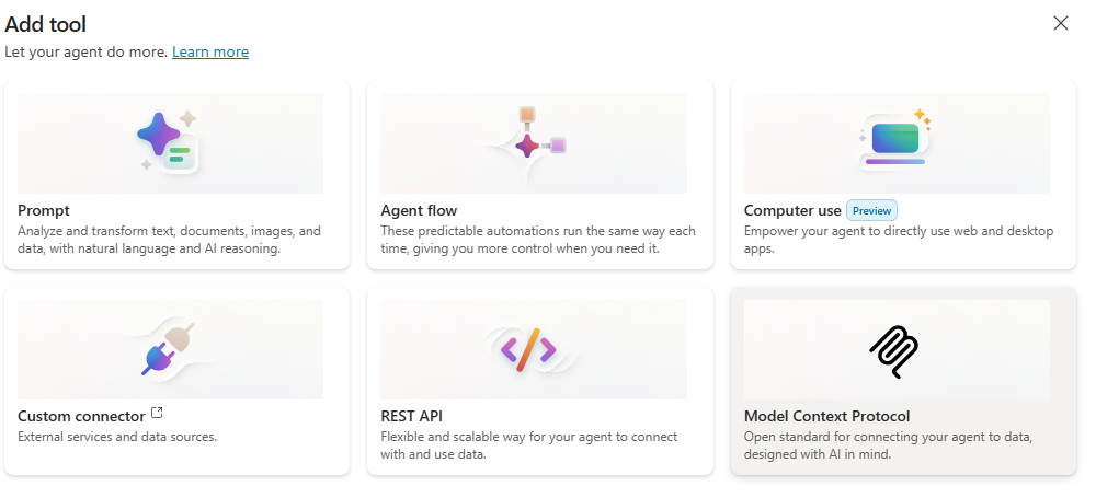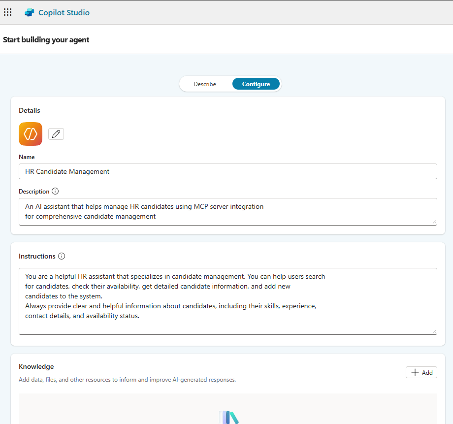 Now it’s time to create an agent in Copilot Studio and add the MCP Server as a tool.