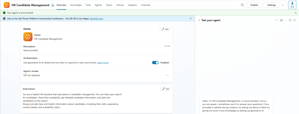 - In the Test your agent pane, prompt List all candidates. Agent will connect to our MCP Server and triggers the list_candidates and generate the response as shown below.