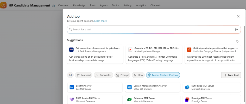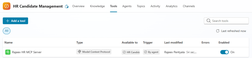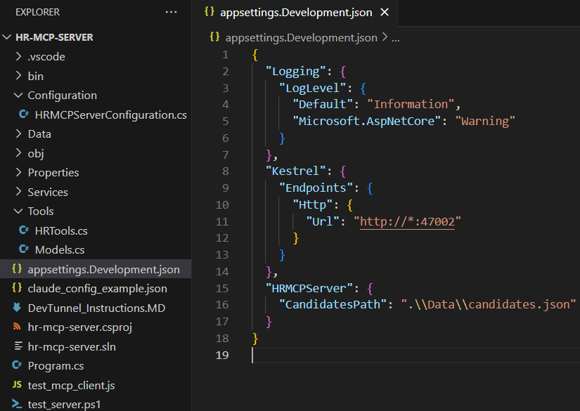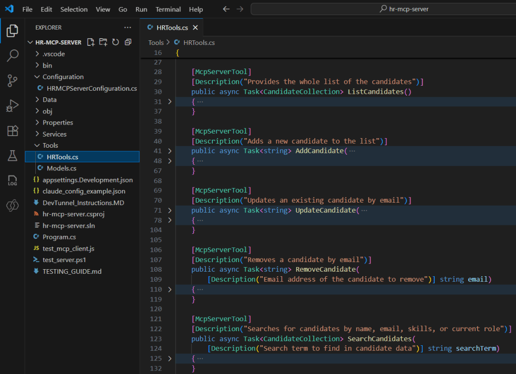 HRTools.csclass, which exposes the following MCP tools (Tools are nothing but C# functions):- ListCandidates: Retrieves all candidates