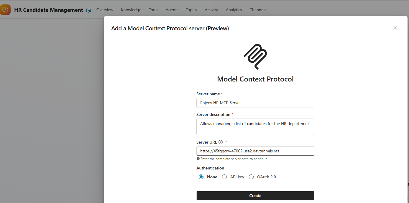- Server URL : Provide the URL that you copied from the dev tunnel with name