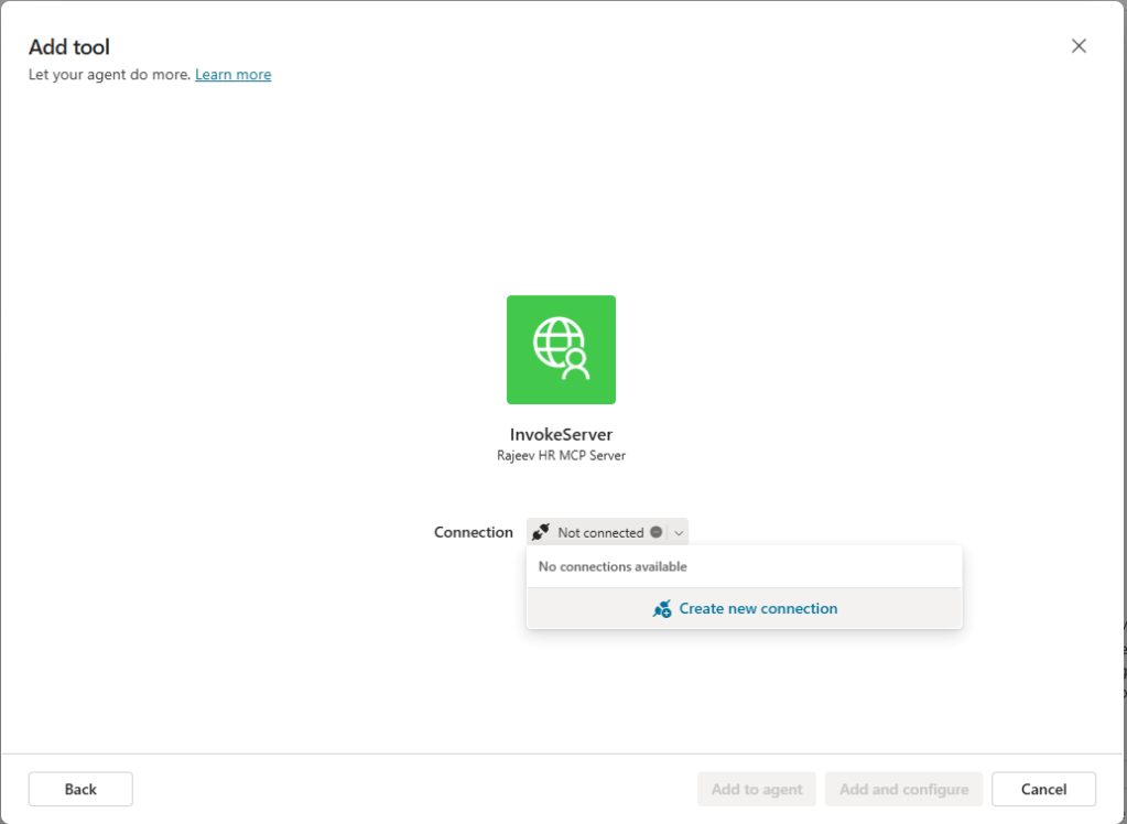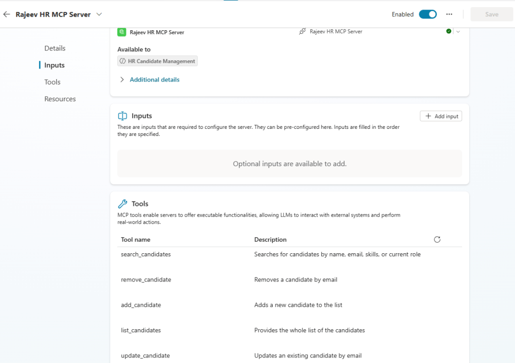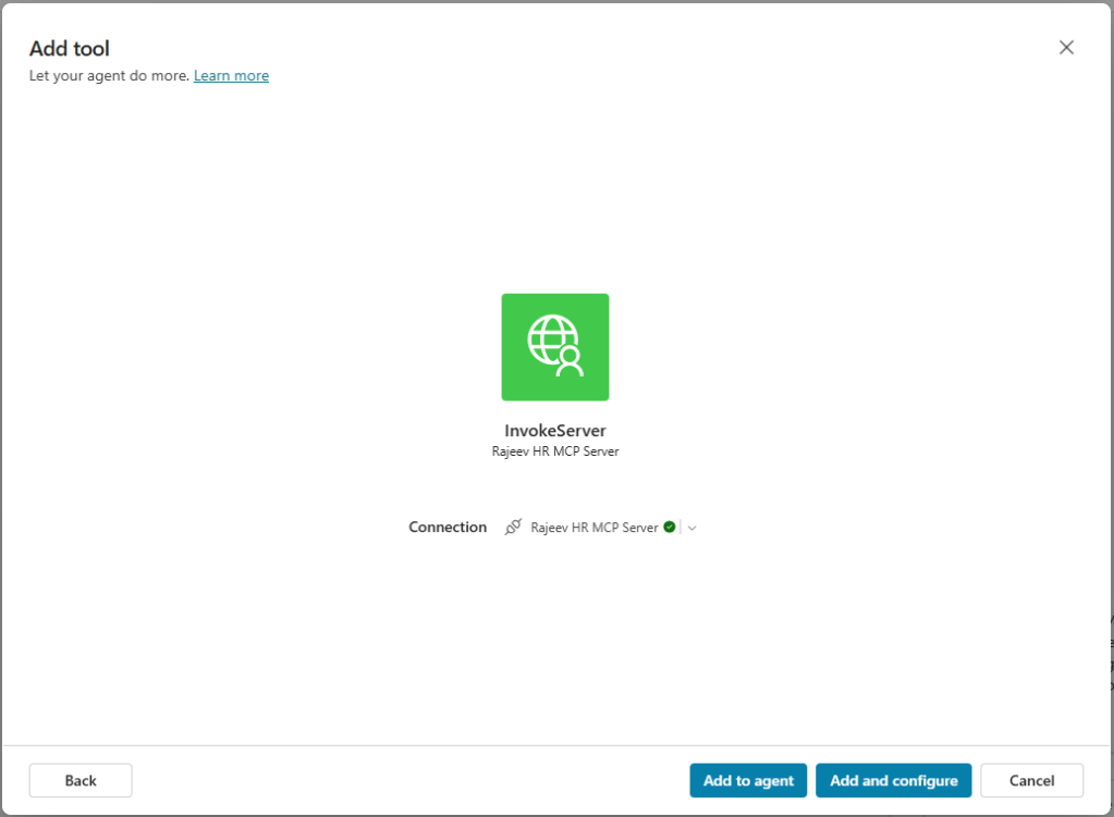 - Click on the Add and configure and see the MCP server and tools properly configured.