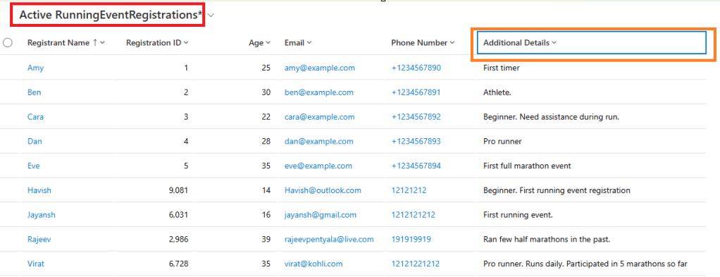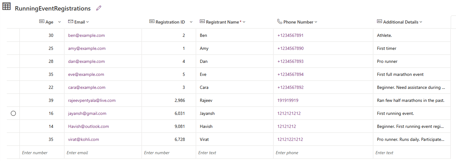 This knowledge source answers questions from RunningEventRegistration dataverse table when user asked about running registrations and participant details.