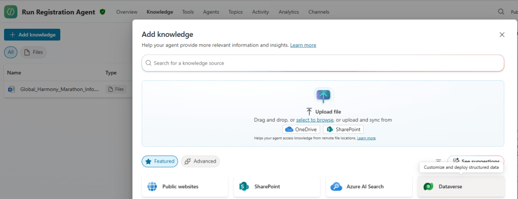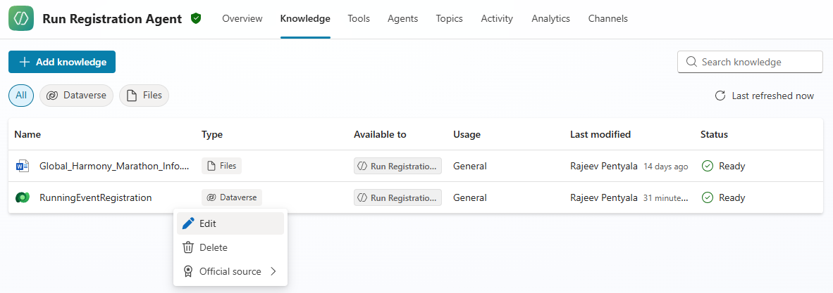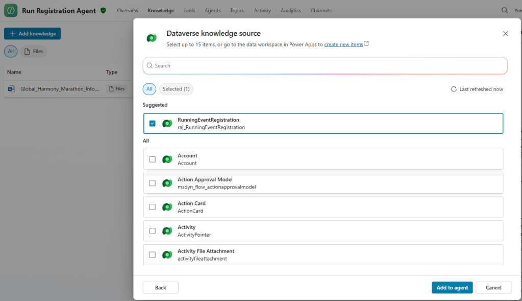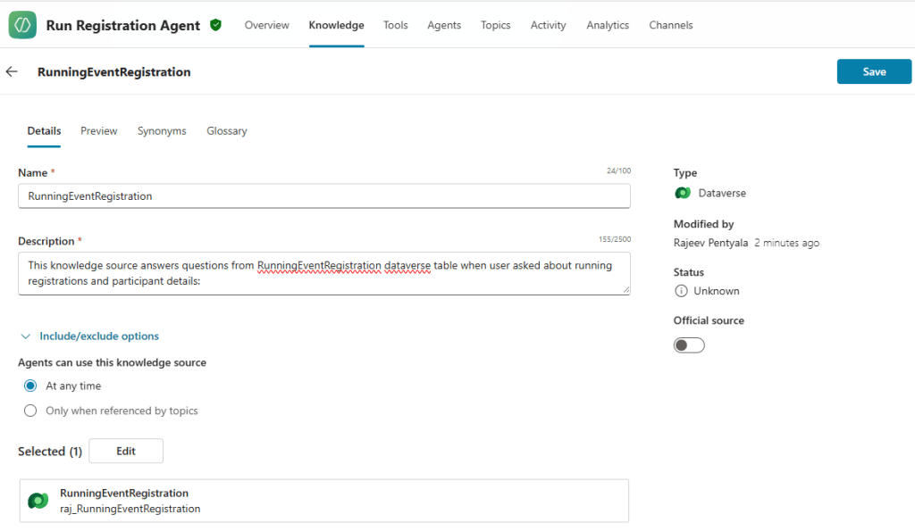 In this article, we’ll Integrate the Dataverse RunningEventRegistrations table as the agent’s knowledge source. This allows the agent to use and respond based on the data stored in the table.