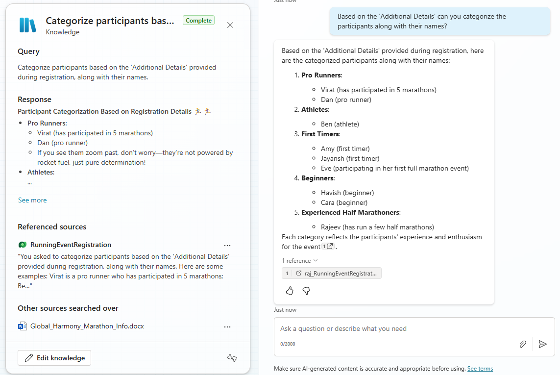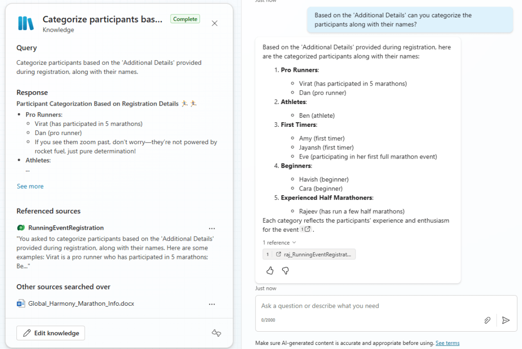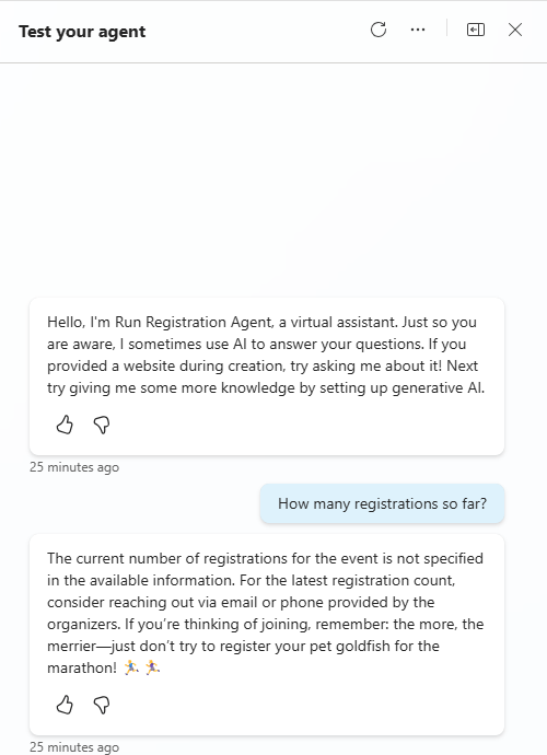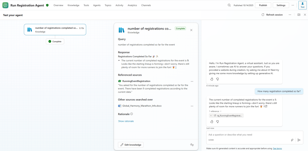 We’ve successfully added the RunningEventRegistration table as a knowledge source. Now it’s time to test the agent.