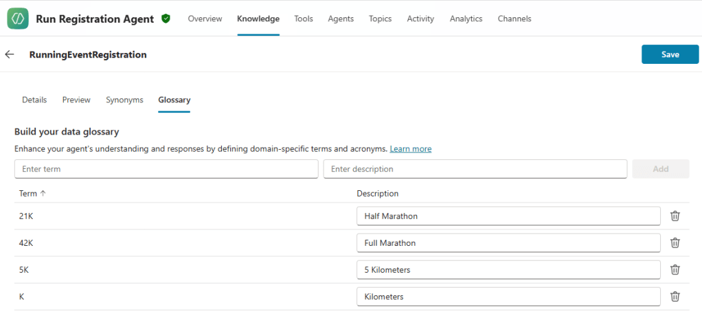 - Configure the Glossary to help the agent understand and paraphrase the terminology used in your Dataverse table. This improves how the agent interprets user questions and delivers more accurate responses.