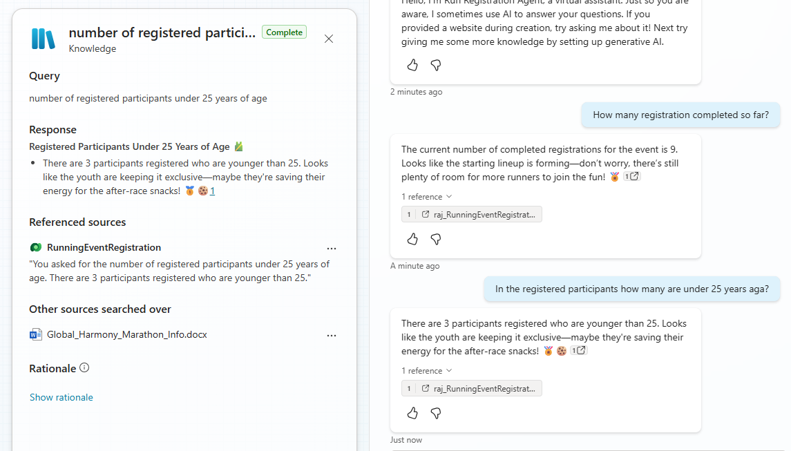- Next, try asking: “Of the registered participants, how many are under 25 years old?”. The agent will search the Age column and return the correct count.