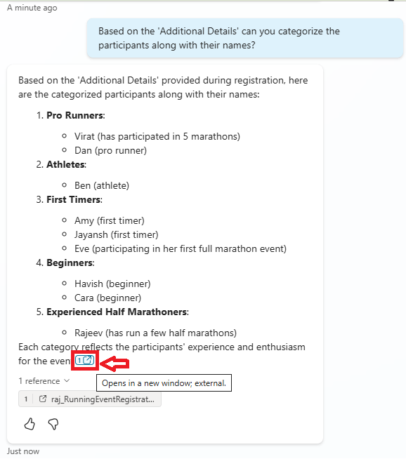 - Ask: “Based on the ‘Additional Details’, can you categorize the participants along with their names?”. The agent will analyze the content in the Additional Details column and respond with categorized participant names.