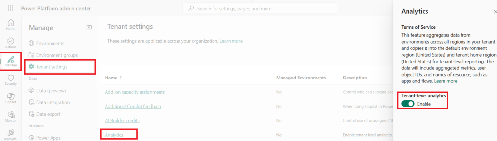 - In the Analytics pane, turn the Tenant-level analytics option to Enable.