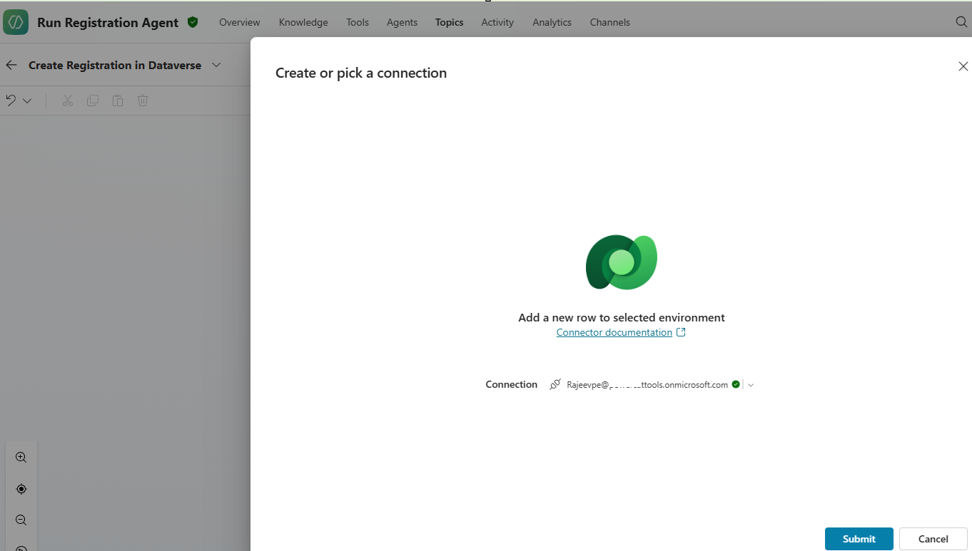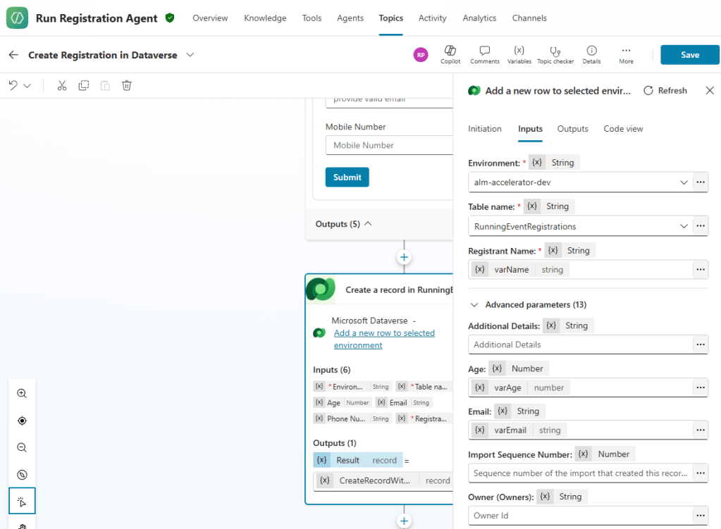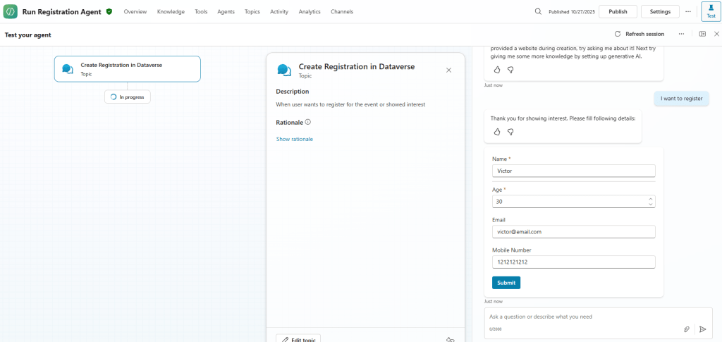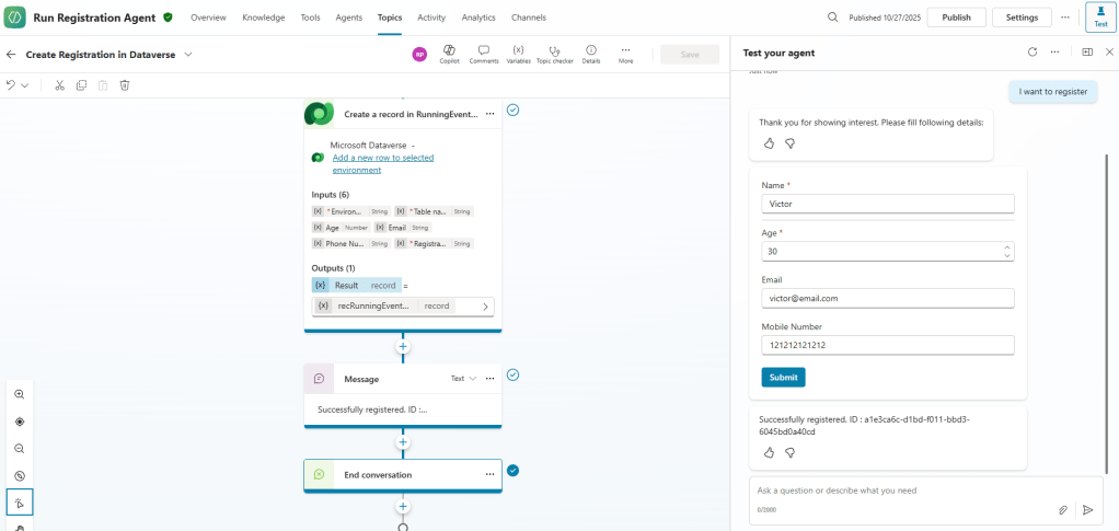 - I have a topic named Create Registration in Dataverse, which is triggered when the end user wants to register for the event.