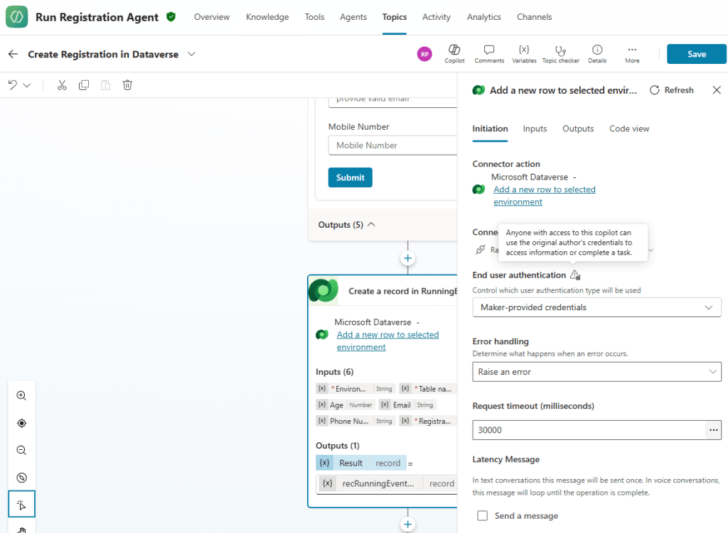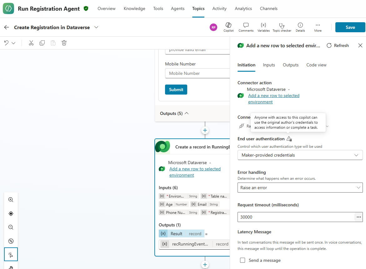 With that, we’ve successfully created a topic that uses the Dataverse tool with end-user authentication set to Maker-provided credentials.