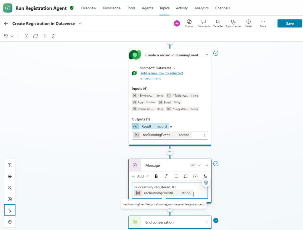 - Finally, I added a Message action to display the GUID of created Dataverse record and End conversation action.