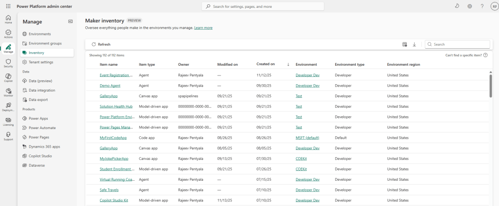 Now, the Power Platform admin center offers tenant administrators a comprehensive, unified view of all key resources—agents and apps—across their organization with Power Platform inventory.