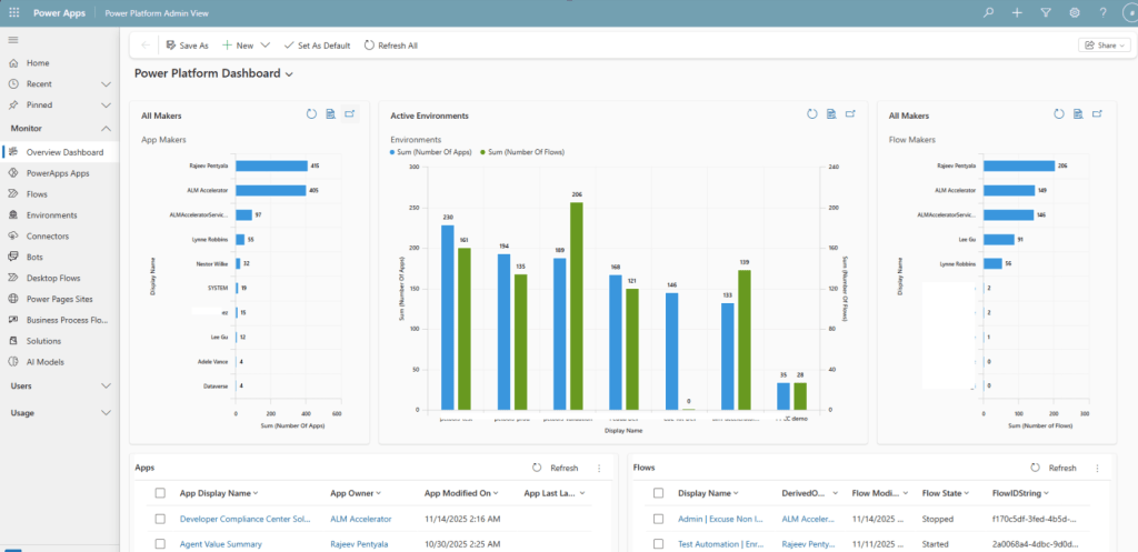 If you are familiar with CoE Starter Kit Inventory feature, you know it provides a centralized view of all your apps and flows across the tenant, as shown below: