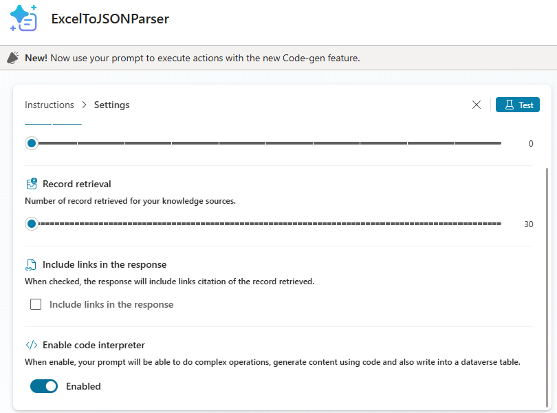 - Add an AI Prompt to the Topic and enable Code Interpreter option to read and convert the Excel data