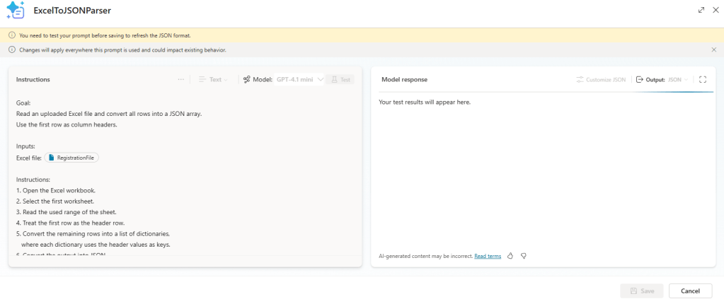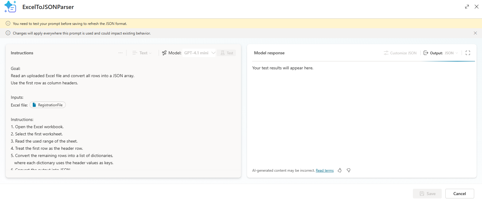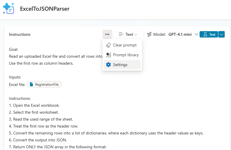 - In the Prompt designer, rename the prompt to ExcelToJSONParser