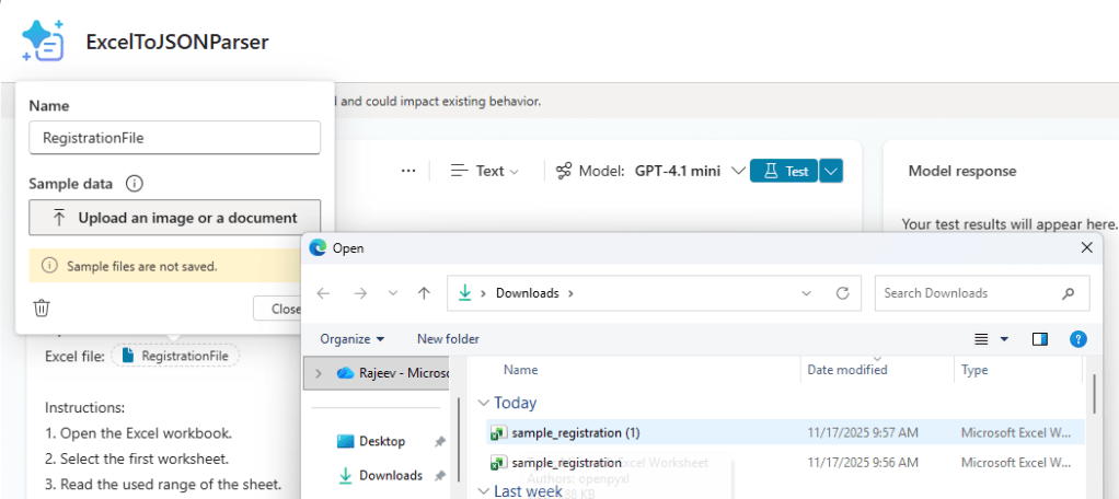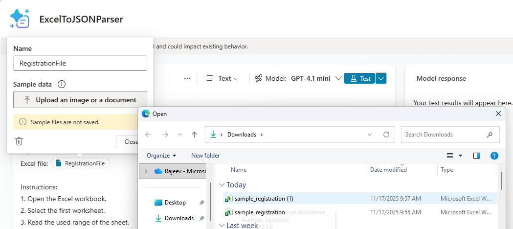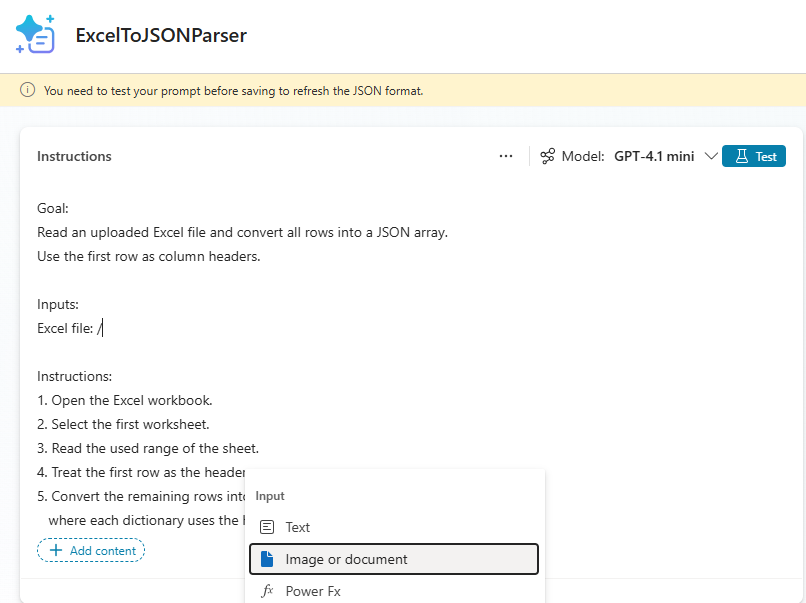 - Now select your sample Excel file and click Test to verify that the prompt can read and process the data correctly.