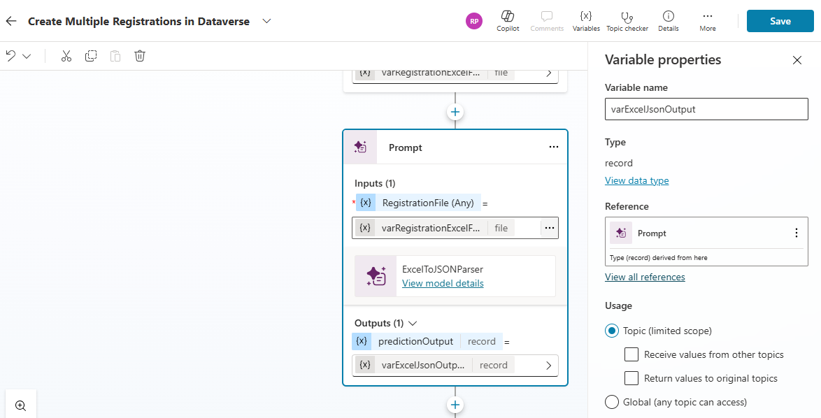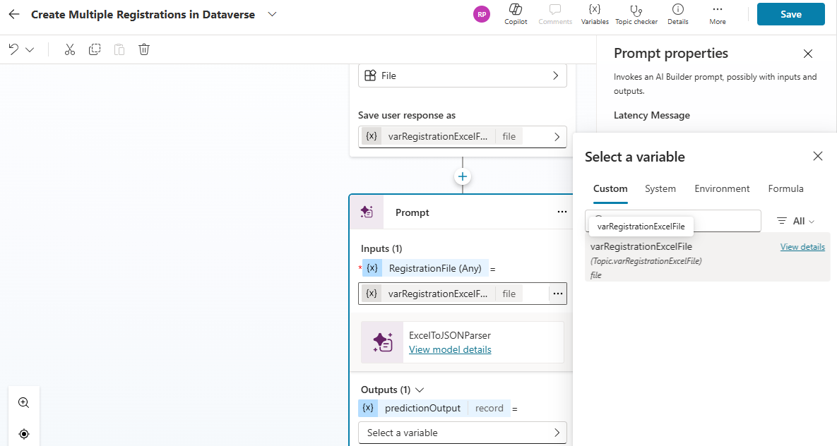- Back in the Topic, pass the varRegistrationExcelFile variable—this is the file uploaded by the user—into the Prompt action.