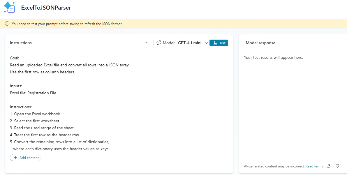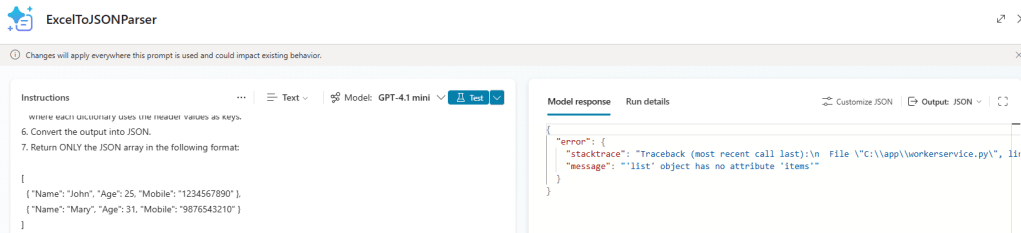 - The Prompt will read the Excel file and return the data in JSON format, as shown in the example below