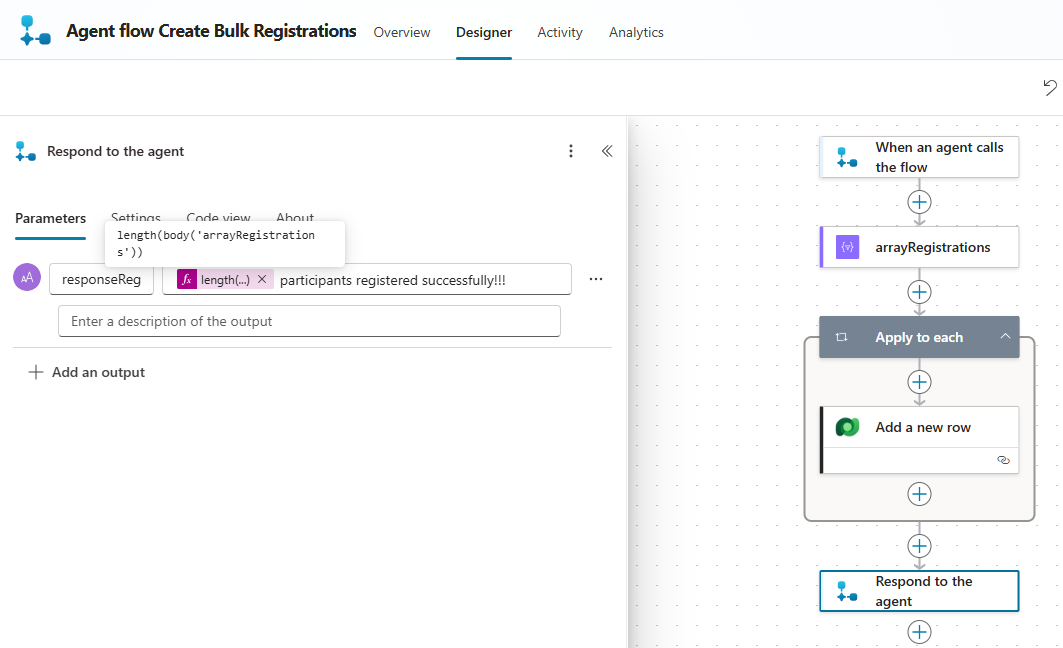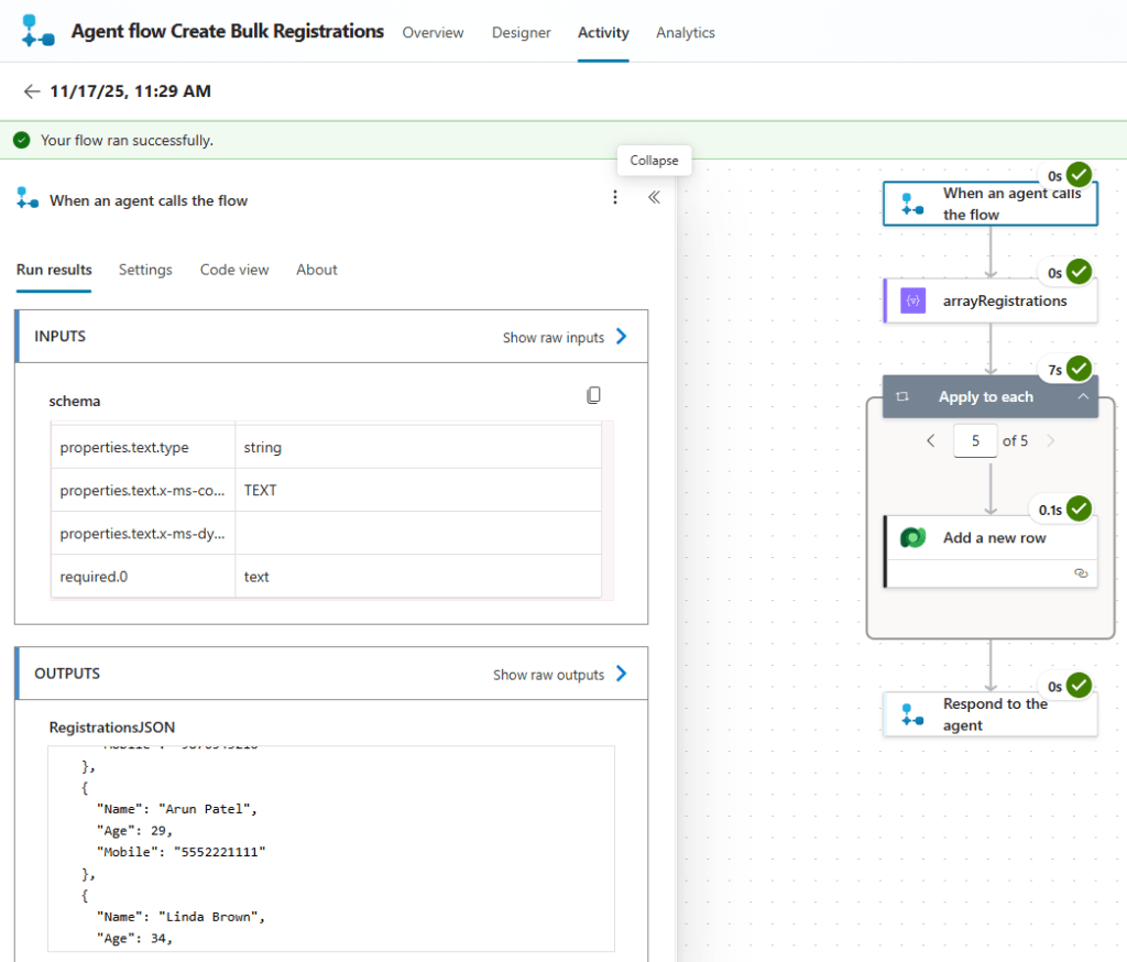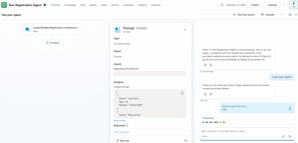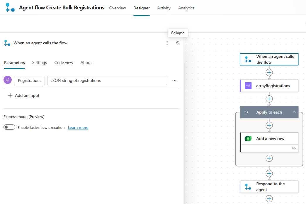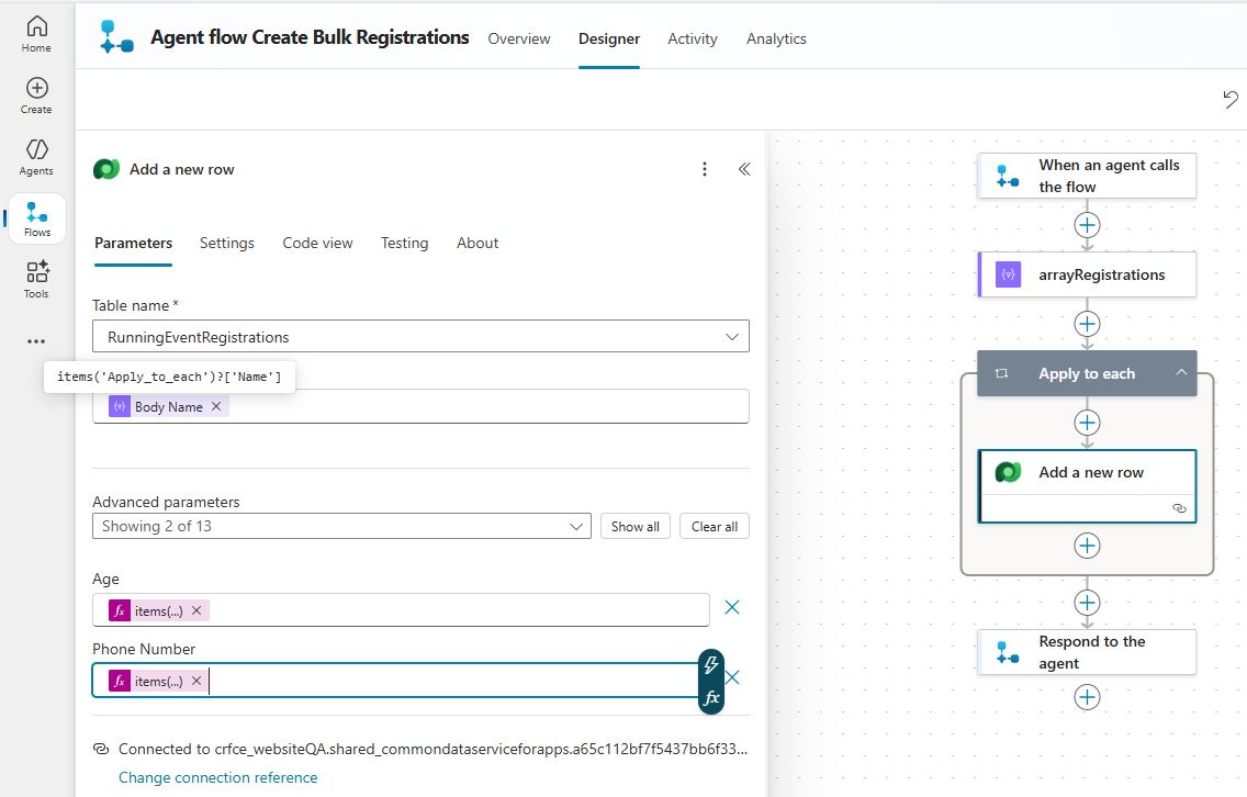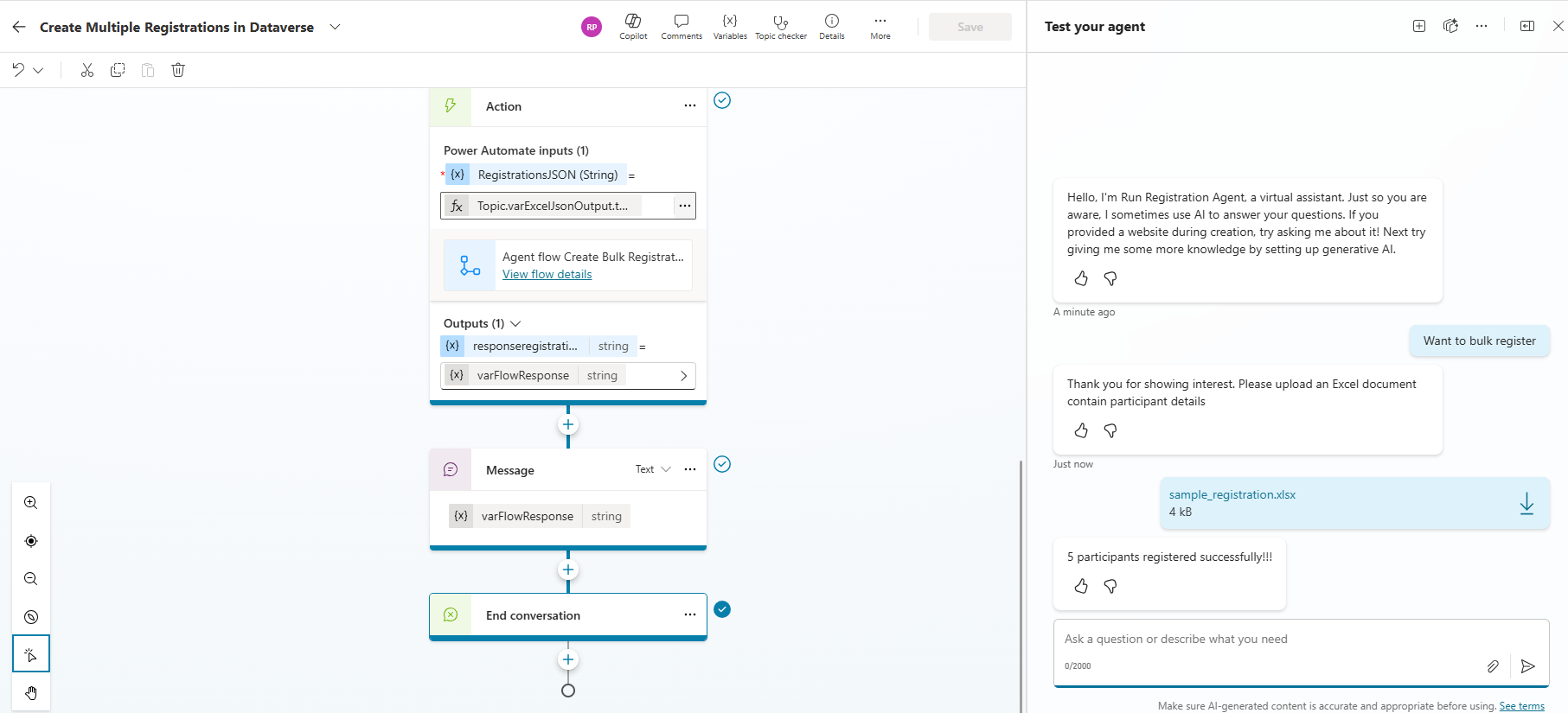 - Use an Agent Flow to loop through the records and create the registrations in the Dataverse table
