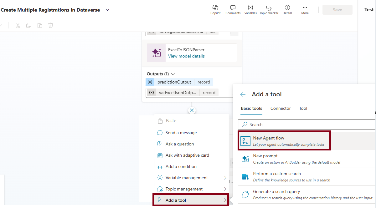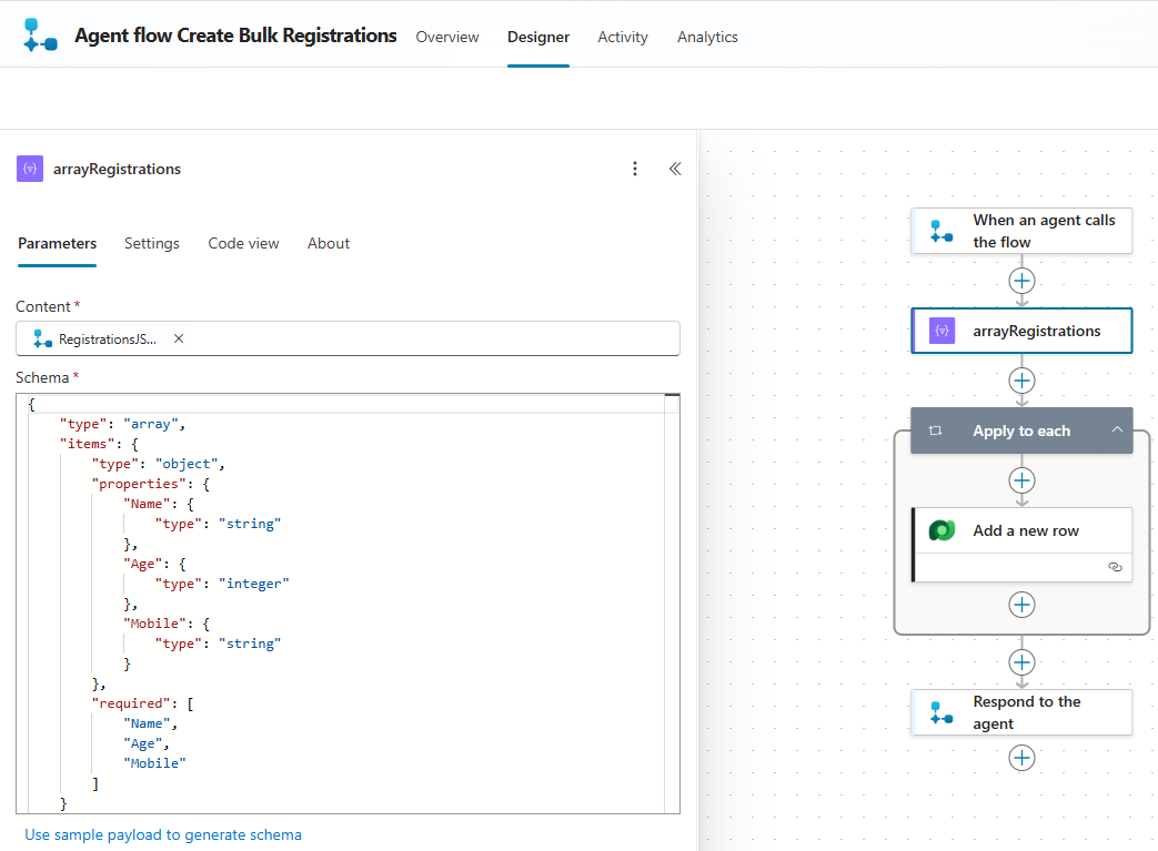 Create an ‘Agent Flow’ to parse JSON and create Dataverse records: