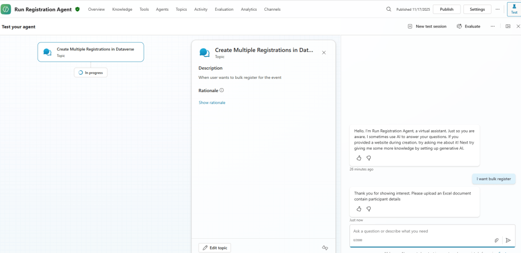 Start by creating a new Topic named “Create Multiple Registrations in Dataverse.”