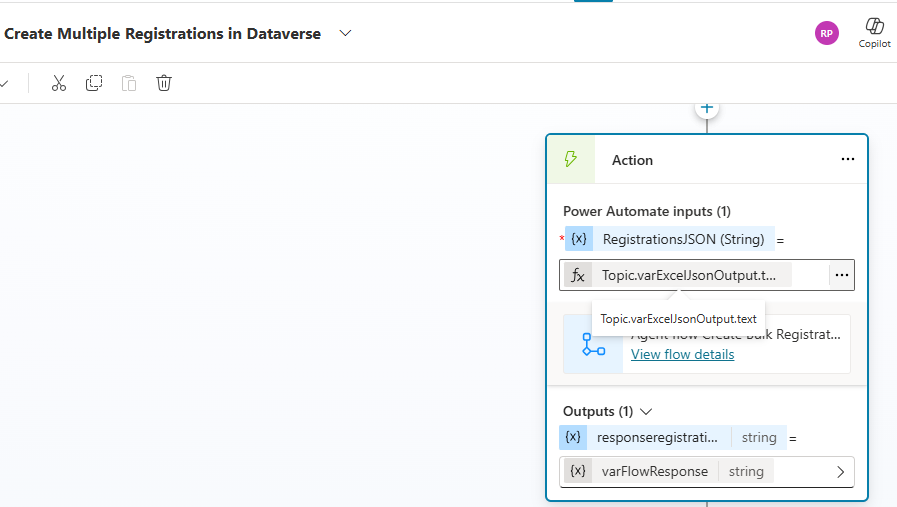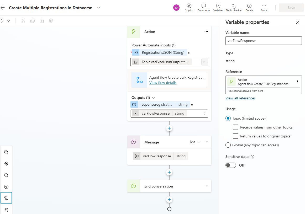 Topic.varExcelJsonOutput.textas the input parameter so the flow receives the JSON array generated by the Prompt.