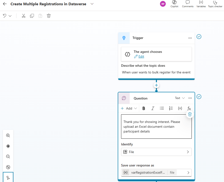 - Add a Question node that prompts the user to upload the Excel file. Store the uploaded file in a variable named varRegistrationExcelFile.