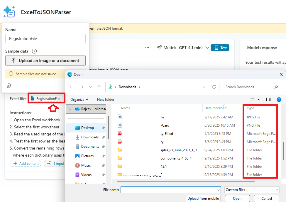 - Provide the Input Name as RegistrationFile. Then click on the Upload an image or document to upload a sample excel file to test the Prompt.